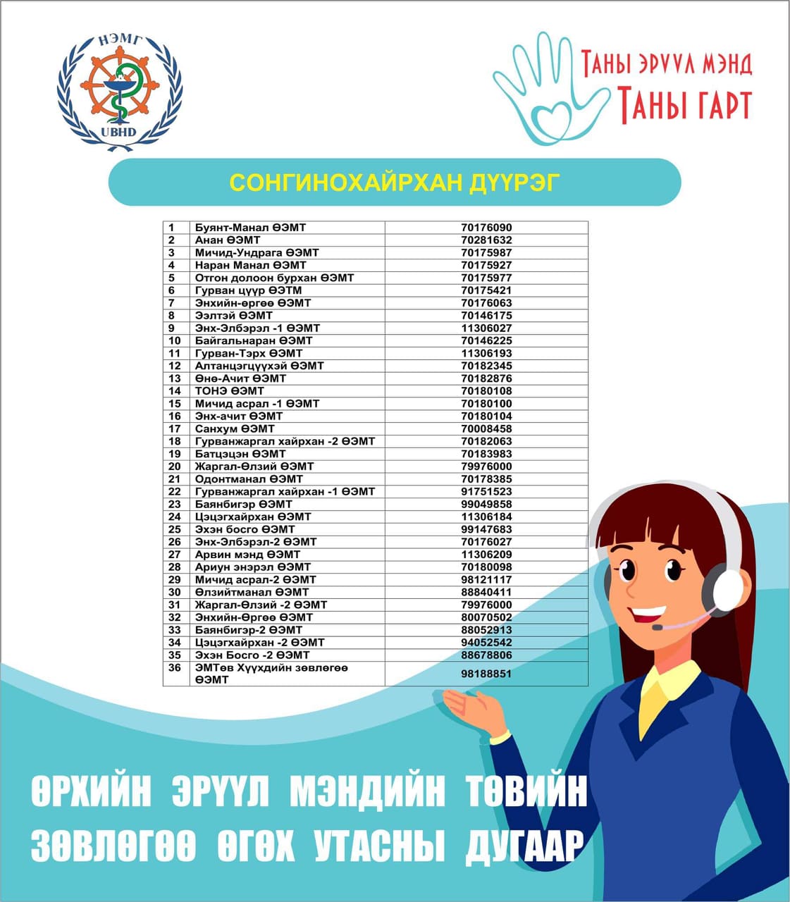 Нийслэлийн Өрхийн эрүүл мэндийн төвүүдийн коронавируст “Ковид-19” халдварын талаарх зөвлөгөө, мэдээлэл өгөх утас. Шаардлагагүй тохиолдолд эмнэлгийн байгууллагад очихгүй байж дугаарын утсаар зөвлөгөө авч халдвараас сэргийлээрэй.
